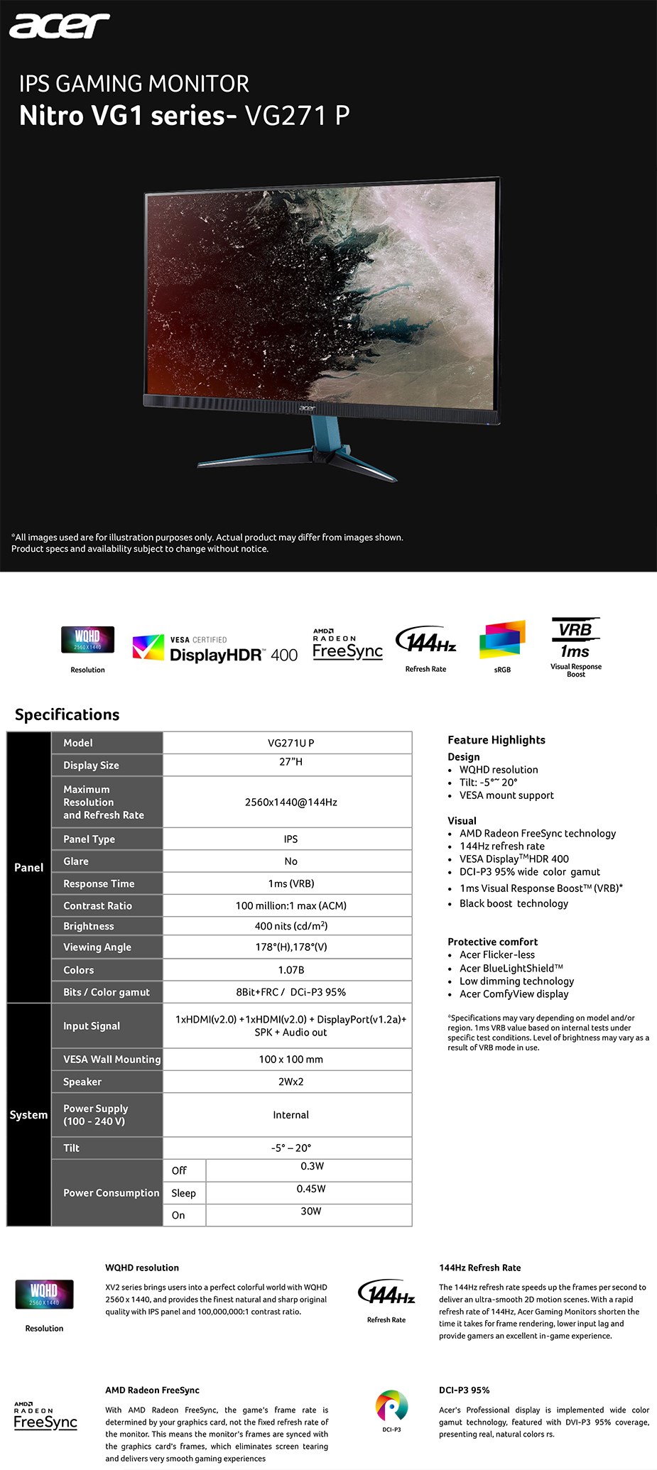 Product Name Acer Nitro VG271UP 27" 144Hz WQHD FreeSync HDR IPS Gaming Monitor