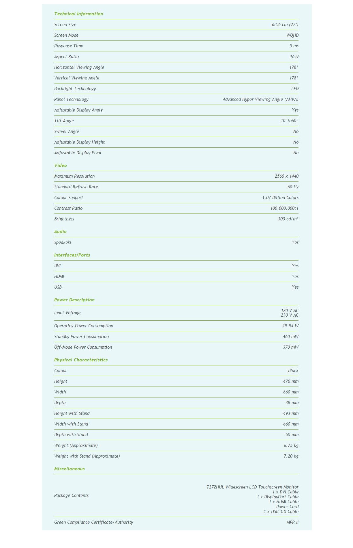 Product Name Acer T272HUL 27" 16:9 WQHD IPS-LED AHVA (2560x1440) Touchscreen Monitor