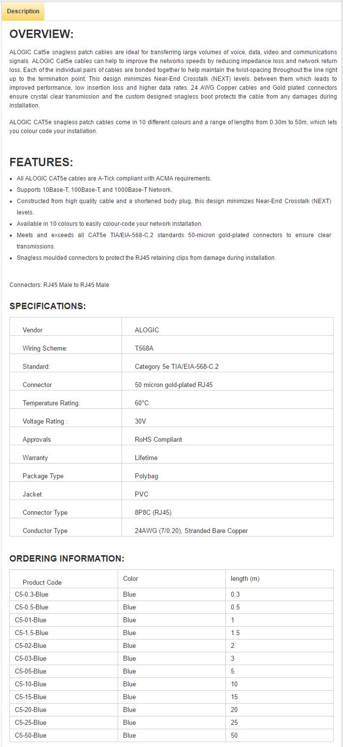 Product Name | Alogic 1.5m Blue Cat5e Network Cable |
