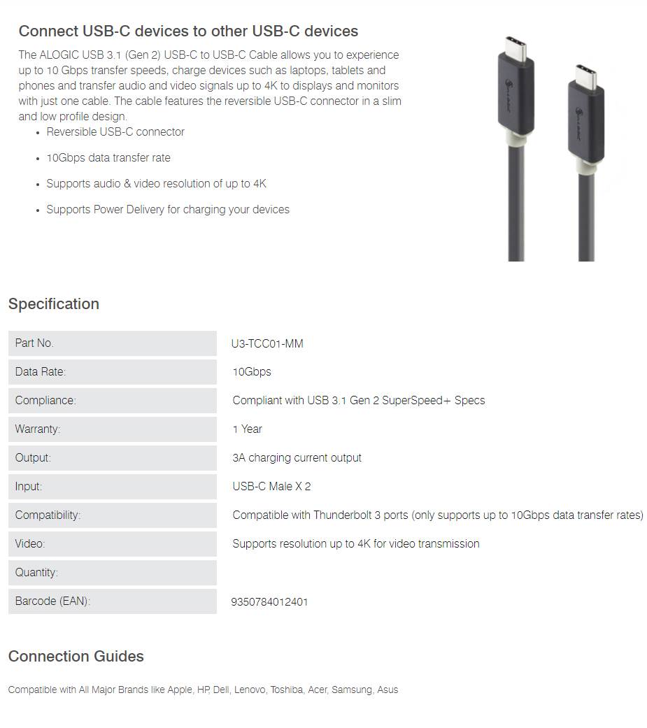 Product Name Alogic 1m USB 3.1 Type-C Cable (M/M)