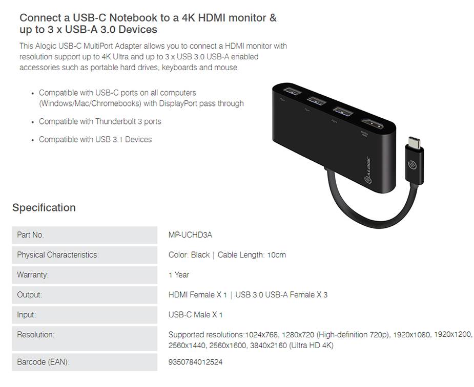 Product Name Alogic USB Type-C HDMI Adapter with 3 Port USB 3.0 Hub