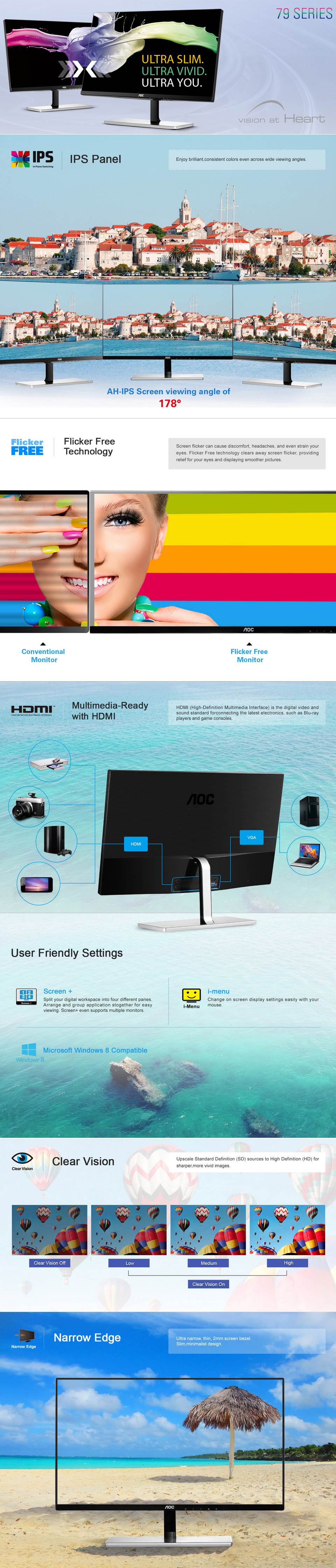 The 23" AOC I2379VHE from the 79 Series is a slim monitor with ultra-vivid picture quality. Framed in an ultra-slim bezel, the monitor is perfect for a multi-display setup, suitable for both home and office. The AH-IPS panel allows for brilliant, consistent colors even across wide viewing angles. Flicker Free technology is included to clear away screen flicker, providing relief for your eyes and displaying smoother pictures. Clear Vision upscales standard definition sources to high definition for even sharper and clearer images. The AOC I2379VHE is equipped with an array of connectivity options, including VGA and HDMI ports.