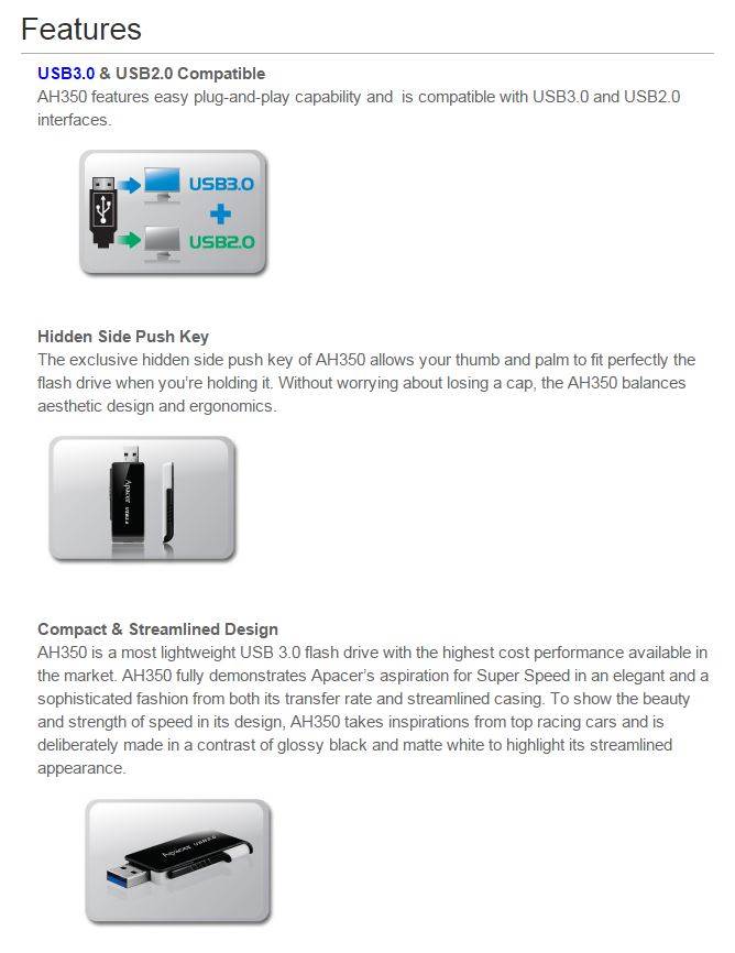 Product Name | Apacer 32GB AH350 USB 3.0 Flash Drive Black AP32GAH350B-1 |