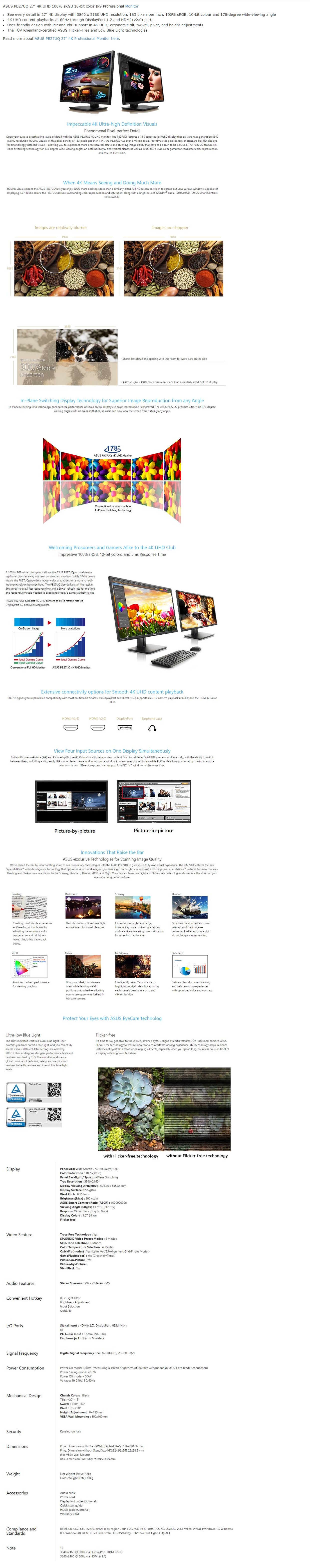 Product Name | ASUS PB27UQ 27" 4K 100% sRGB 10-bit color IPS Professional Monitor |