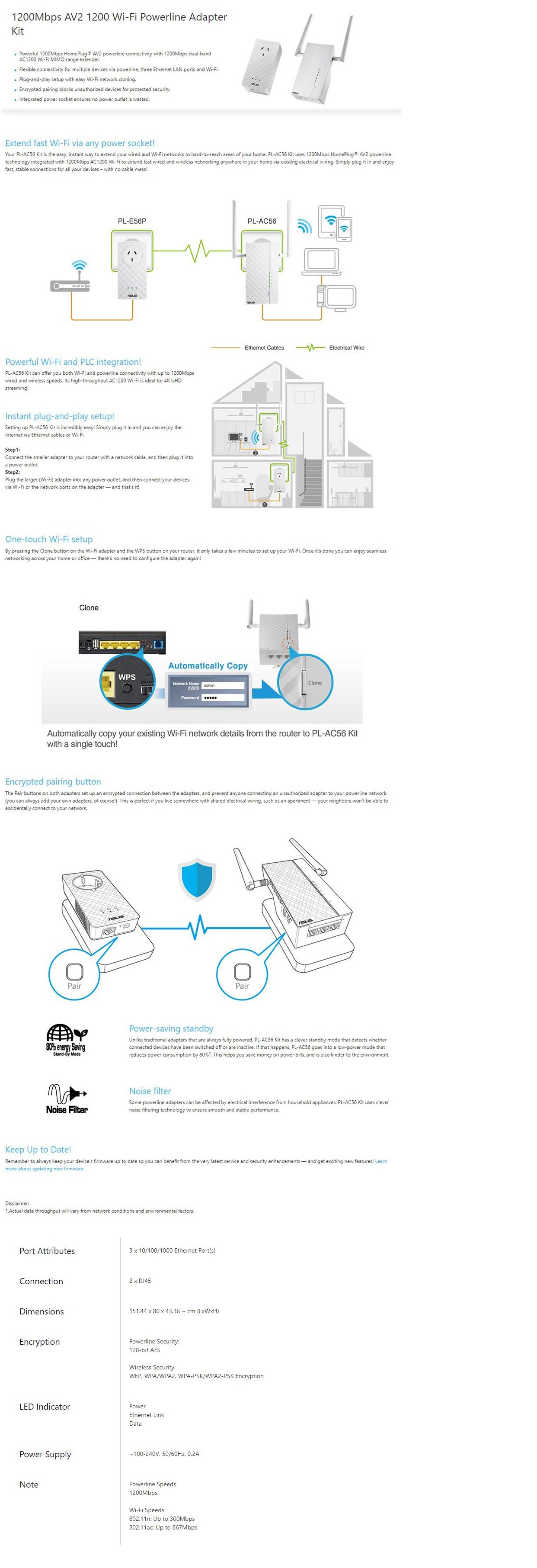 ASUS PL-AC56 1200Mbps AV2 1200 Wi-Fi Powerline Adapter Kit Powerful 1200Mbps HomePlug® AV2 powerline connectivity with 1200Mbps dual-band AC1200 Wi-Fi MIMO range extender. One-touch Wi-Fi setup, Power-saving standby, Noise filter, 2 x RJ45, 3 x Gigabit Ethernet ports