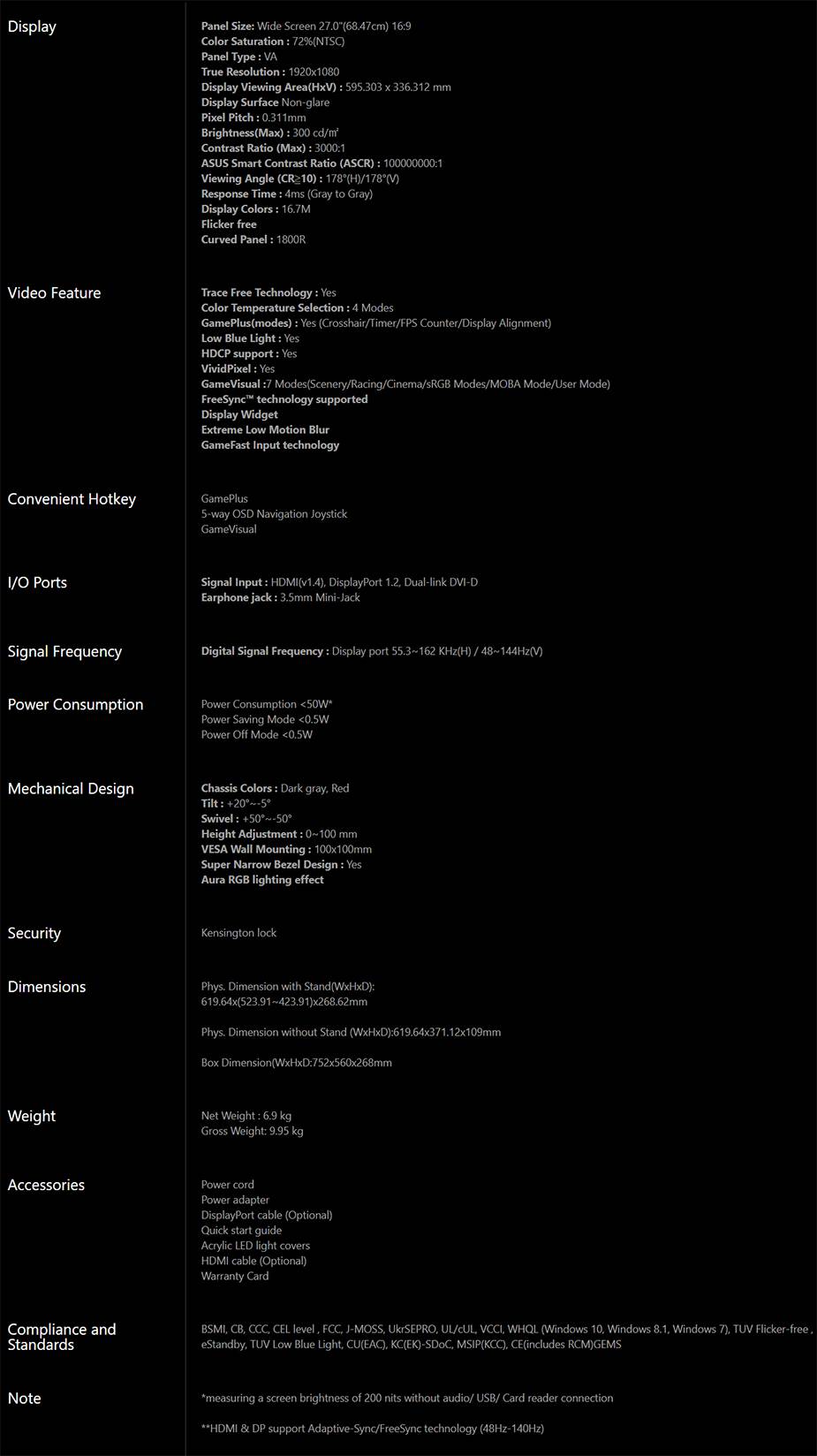 Product Name | ASUS ROG Strix XG27VQ 27" Curved FreeSync Gaming Monitor Display |