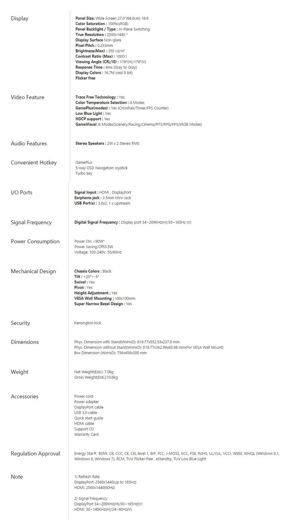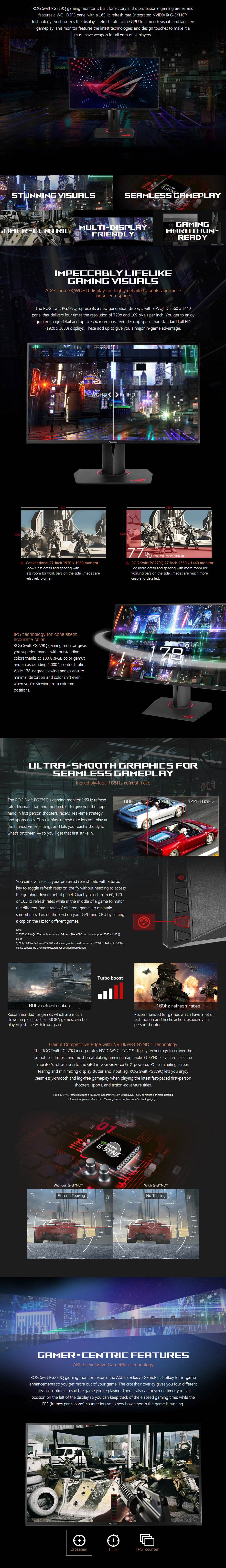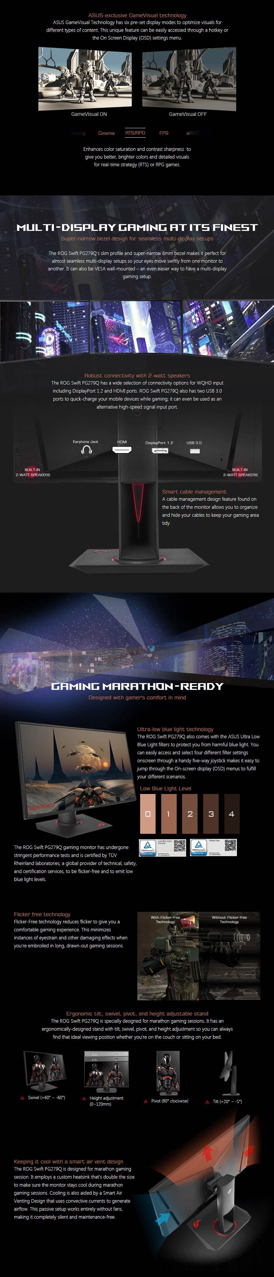 ROG Swift PG279Q gaming monitor is built for victory in the professional gaming arena and features a WQHD IPS panel with a 165Hz refresh rate. Integrated NVIDIA G-SYNC™ technology synchronizes the display's refresh rate to the GPU for smooth visuals and lag-free gameplay. This monitor features the latest technologies and design touches to make it a must-have weapon for all enthusiast players.