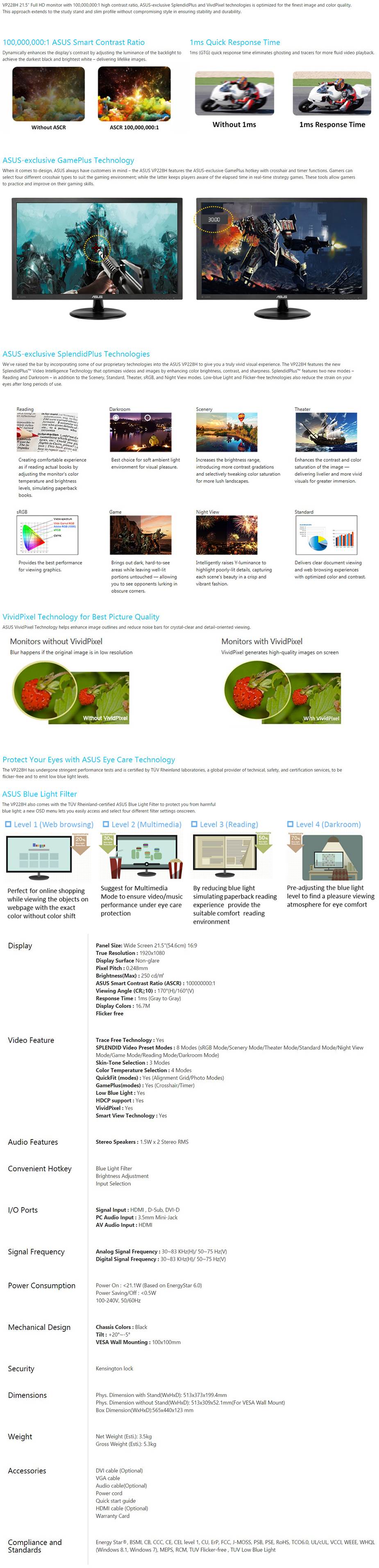 Product Name | ASUS VP228H 21.5" Black 1920 x 1080 1ms GTG HDMI Monitor |