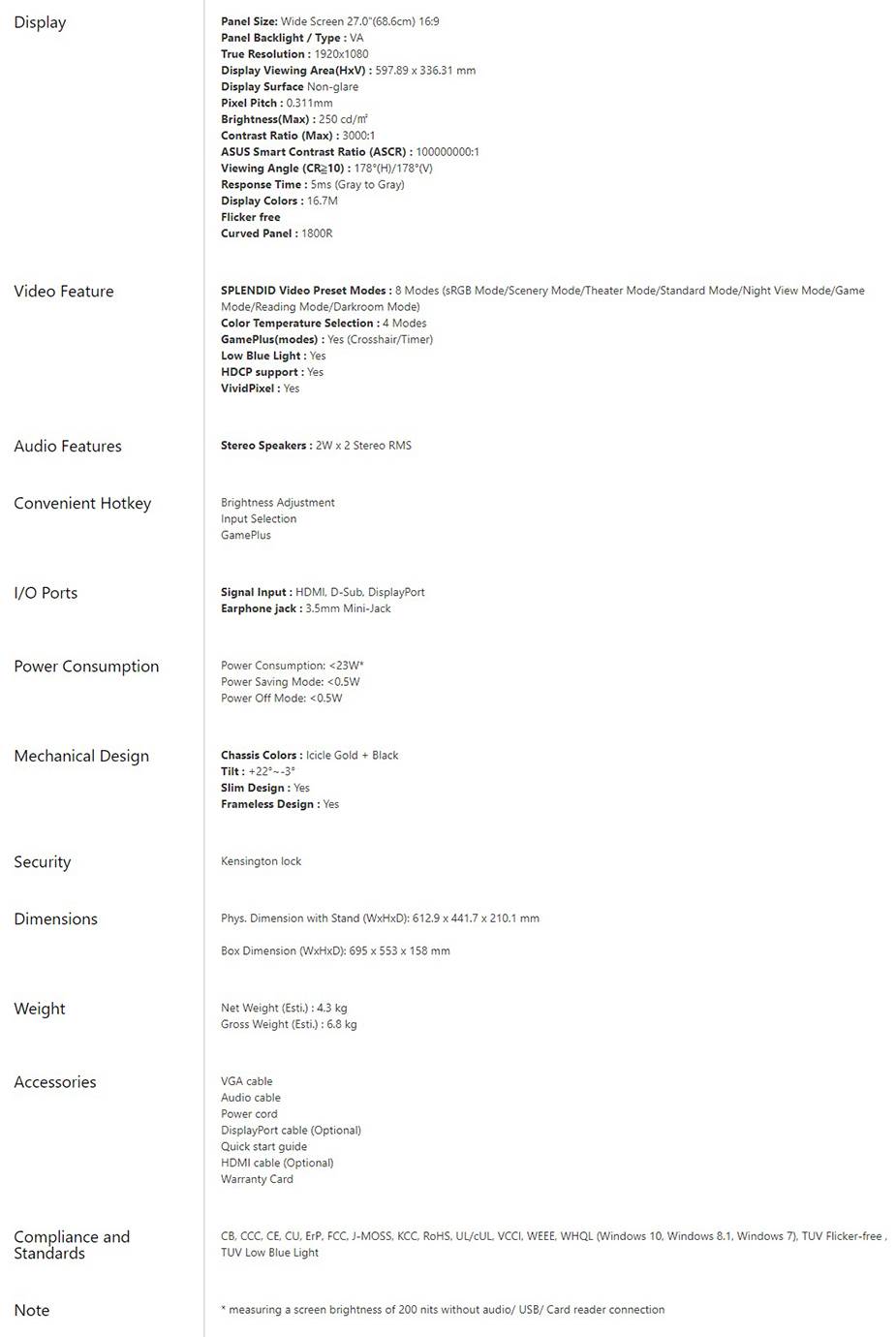 Product Name ASUS VZ27VQ 27" FHD Curved LCD Monitor Display