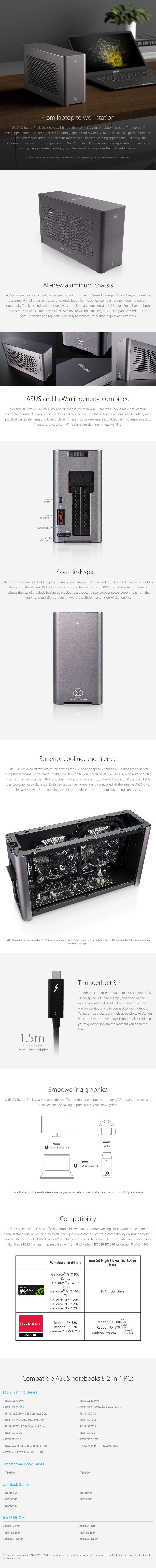 ASUS XG Station Pro Thunderbolt 3 External Graphics Card Enclosure - I/O Ports: 1x USB 3.1 Gen 2 - Thunderbolt 3 Connection - Colour: Spacy Grey - ASUS AURA Sync RGB Supported - Power Supply: 330W - Dimensions: 37.5 x 10.7 x 2.05 cm - Weight: 2.95 KG - Includes 1x 1.5m Active Thunder Bolt 3 Type-C Cable - XG-STATION-PRO - 3 Years Limited Warranty
