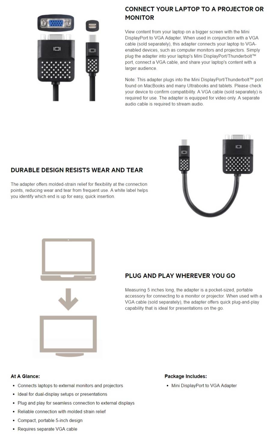 Product Name | Belkin 12.7cm Mini DisplayPort to VGA Male-Female Adapter Cable |