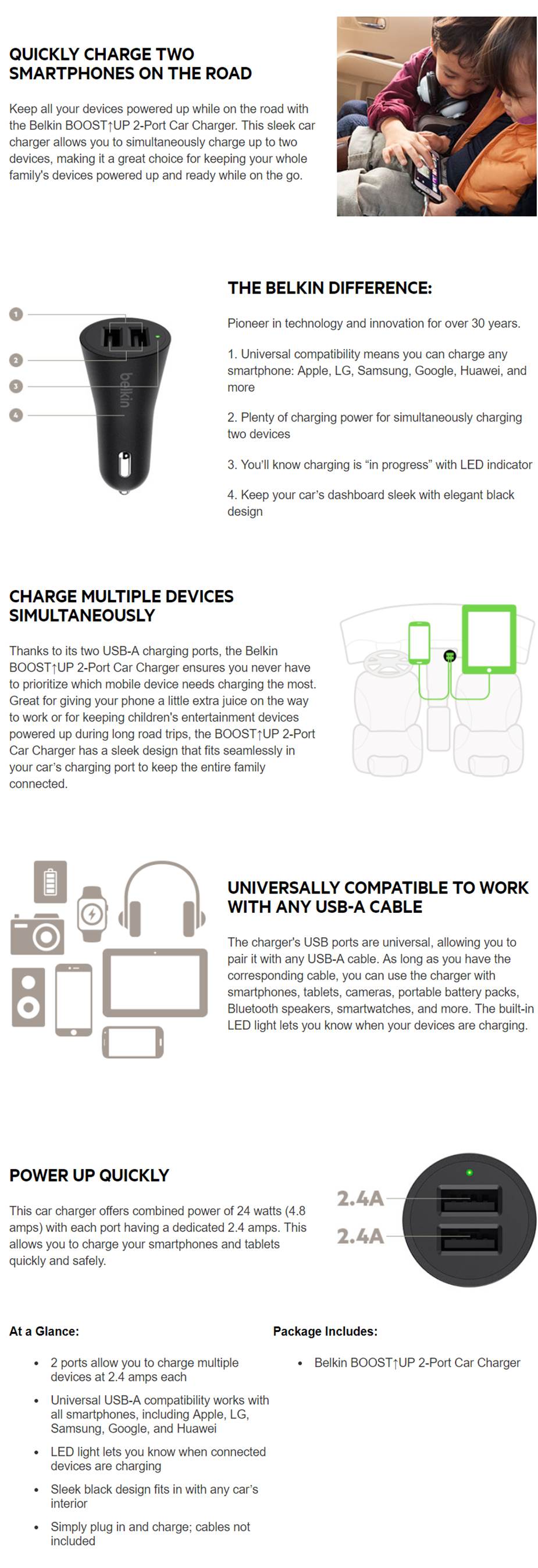 Belkin Boost Up 24W 2-Port Car Charger - Black - 2 ports allow you to charge multiple devices at 2.4 amps each - USB-A - Led Lights - Cables not included - F8M930BTBLK - 2 Years Limited Warranty