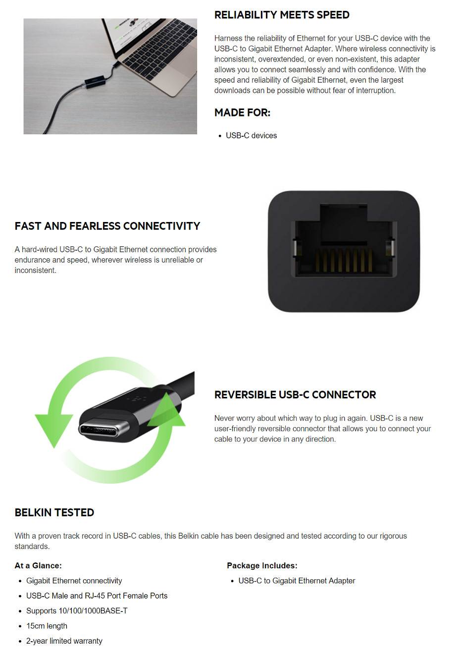 Description Belkin F2cu040btblk Usb-c To Gigabit Ethernet Adapter