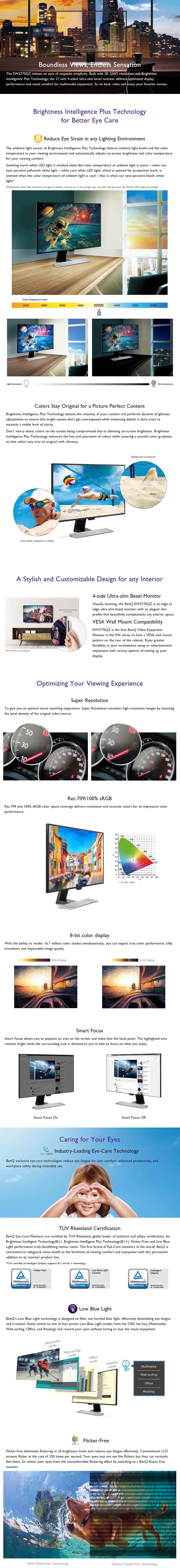 BenQ EW2770QZ 27" QHD AMVA+ Monitor - 2560 x 1440 - 1000:1 - 350nits - 2x HDMI, 1x Display Port - Smart Focus - 100 Percent sRGB - 3 Years Limited Warranty |