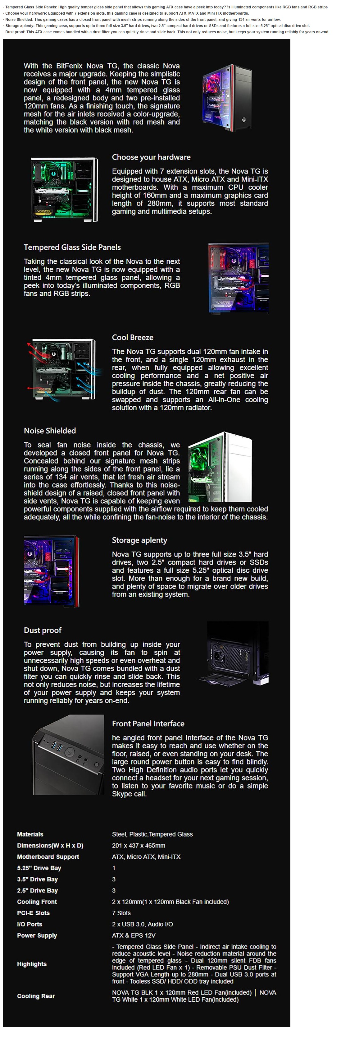 Bitfenix Nova TG ATX Mid-Tower Tempered Glass Case - Black - 1x 5.25" drive bay, 3x 3.5" drive bays, 3x 2.5" drive bays - Rear expansion slots: 7 - 2x 120mm Front Fans (1x Included), 1x 120mm Rear Red LED Fan (Included) - 1x 3.5mm Audio I/O, 2x USB 3.0 - Removable PSU Dust Filter - Tooless SSD/ HDD/ ODD tray included - ATX/Micro-ATX/Mini-ITX - BFX-NTG-100-KKWSK-RP - 12 Months Limited Warranty