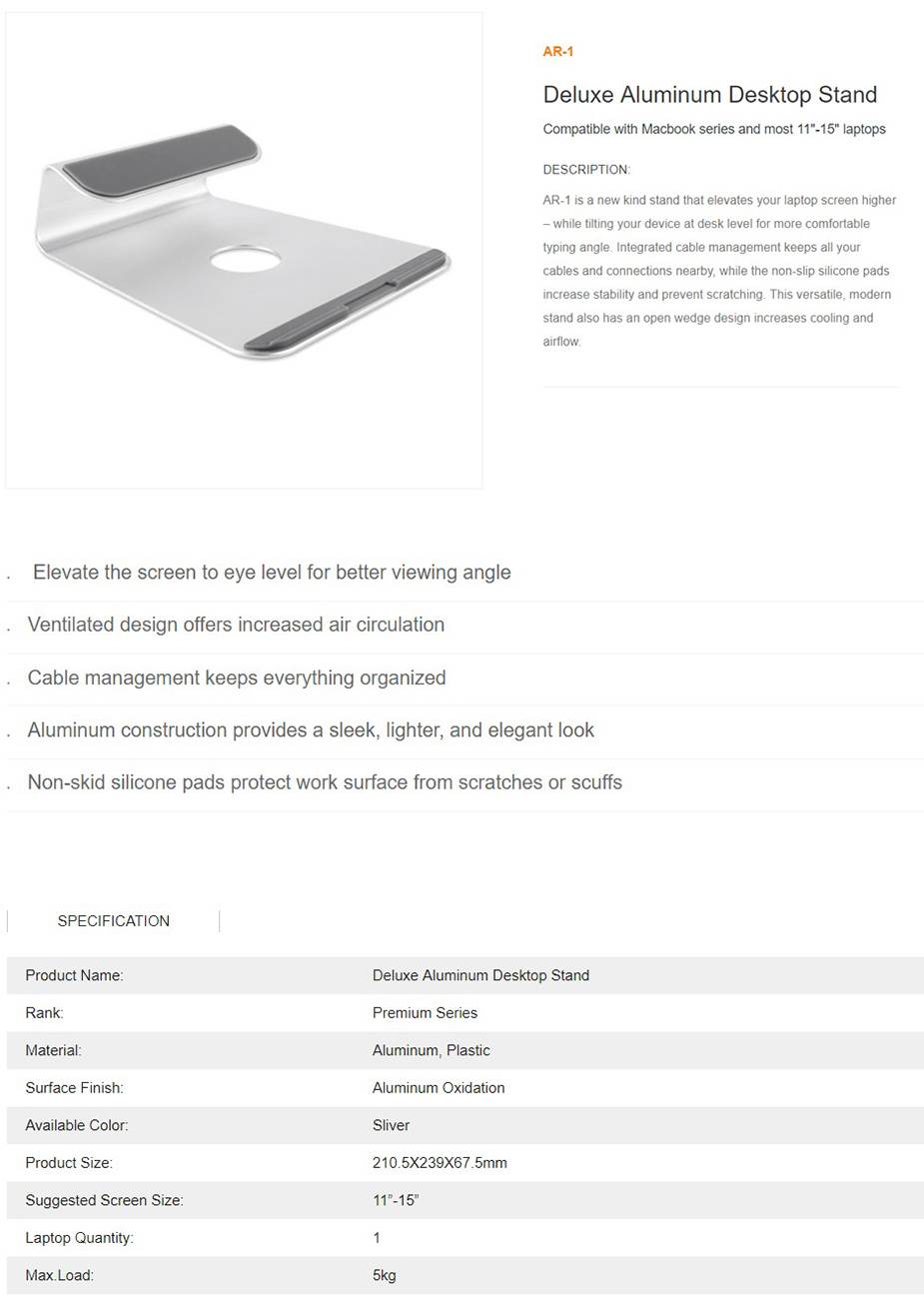 Product Name | Brateck Deluxe Aluminium Desktop Stand for most 11''-15'' Laptops |