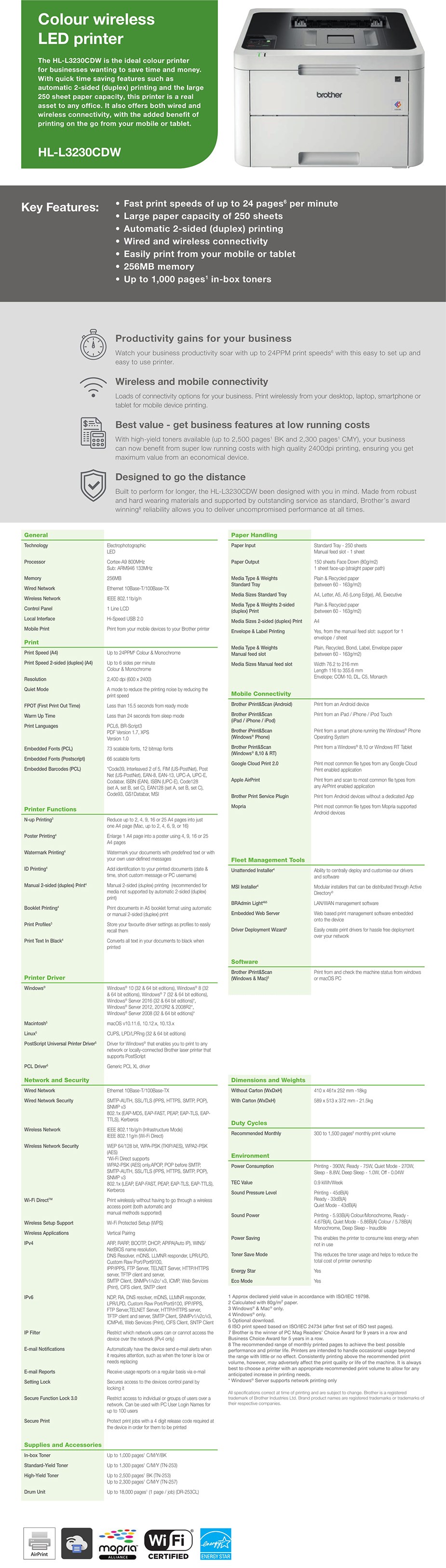 Brother HL-L3230CDW Wireless Colour LED Laser Printer - Print Speed: Up to 24 ppm Mono/Colour - Print Resolution: Up to 2400x600dpi, 600x600dpi - USB 2.0, 10/100Base-TX Ethernet, IEEE 802.11b/g/n Wireless, Wi-Fi Direct - Mobile and Web Printing - Maximum Paper Size: A4 - 12 Months Limited Warranty