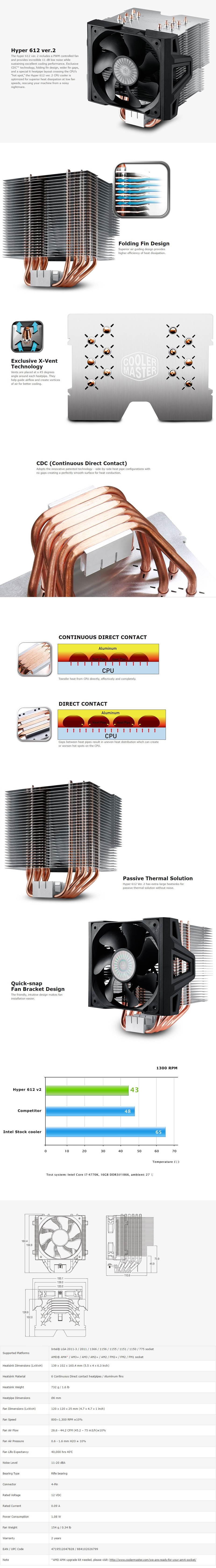 The hyper 612 ver. 2 includes a PWM controlled fan and provides incredible 11 dB low noise while sustaining excellent cooling performance. Exclusive CDC™ technology, folding fin design, wider fin gaps, and a special 6 heatpipe layout crossing the CPU’s “hot spot,' the Hyper 612 ver. 2 CPU cooler is optimized for superior heat dissipation at low fan speeds, rescuing your machine from a noisy nightmare.