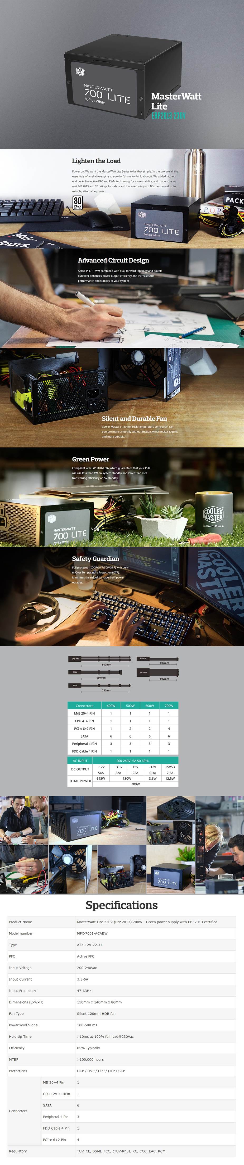 Product Name CoolerMaster MasterWatt Lite 700W 80+ Certified Power Supply MPX-7001-ACABW-AU
