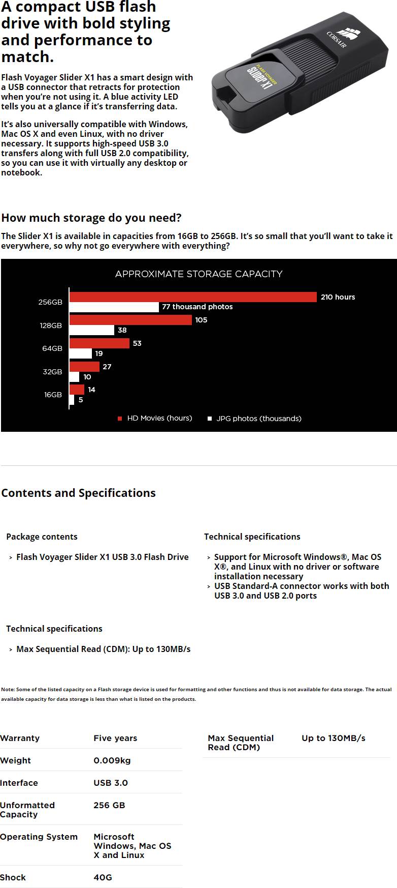Description Corsair Flash Voyager Slider X1 256gb Usb 3.0 Flash Drive - Capless Design Read 130mbs Plug And Play
