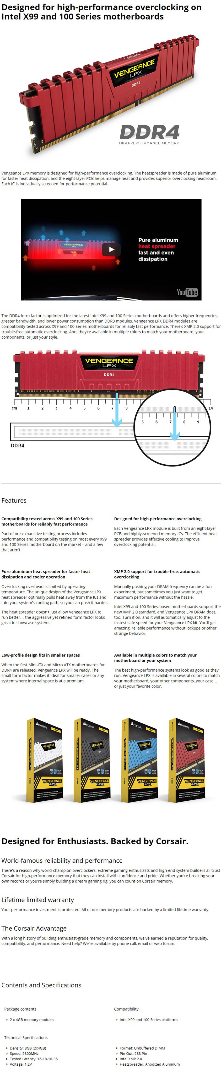 Product Name | Corsair 8GB CMK8GX4M1A2666C16R DDR4 2666MHz Vengeance LPX DIMM Red |
