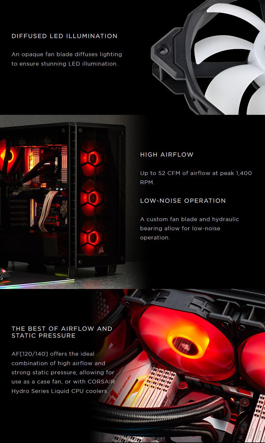 Corsair AF Series AF120 LED 120mm Fan - Red - 3 Pack - 3x 120mm Fans - Red LED 3 PIN - Hydraulic Bearing - Airflow: Up to 52 CFM (Peak 1,400RPM) - Noise Level: 26dBA - Hub-mounted LEDs - Low-noise operation - CO-9050083-WW - 2 Years Limited Warranty