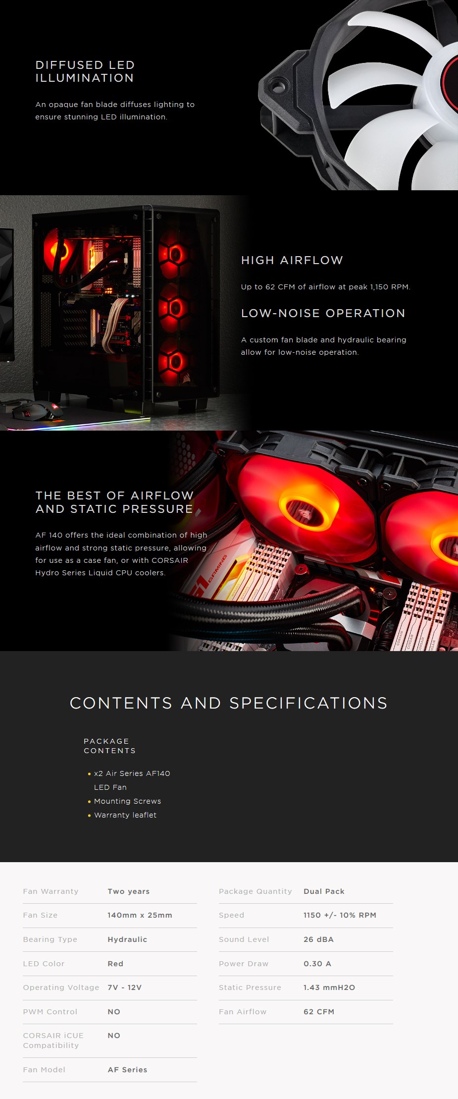 Corsair Air Series AF140 LED (2018) Low Noise 140mm Fan - Red - 2 Pack - Airflow: 62CFM - Speed: 1150 +/- 10% RPM - Sound Level: 26 dBA - Fan Size: 140mm x 25mm - Hydraulic Bearing - 7V-12V Operating Voltage - LED Colour: Red - CORSAIR LINK v4.9 or higher is required for lighting control - CO-9050089-WW - 2 Years Limited Warranty