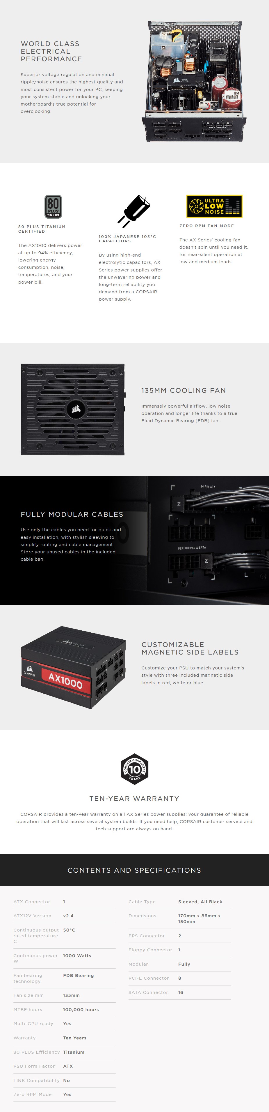 Corsair AX1000 80 PLUS Titanium Fully Modular ATX Power Supply - 135mm Zero RPM Cooling Fan - Fully Modular Design - 100% All Japanese 105°C capacitors - Connectors: 1x ATX Cable (20+4Pin), 2x EPS/ATX12V (4+4Pin), 2x SATA (4 SATA Right-angle), 2x SATA (4 SATA Straight), 2 Peripheral (4Pin), 1 Floppy (4Pin) - Black - CP-9020152-AU - 10 Years Limited Warranty