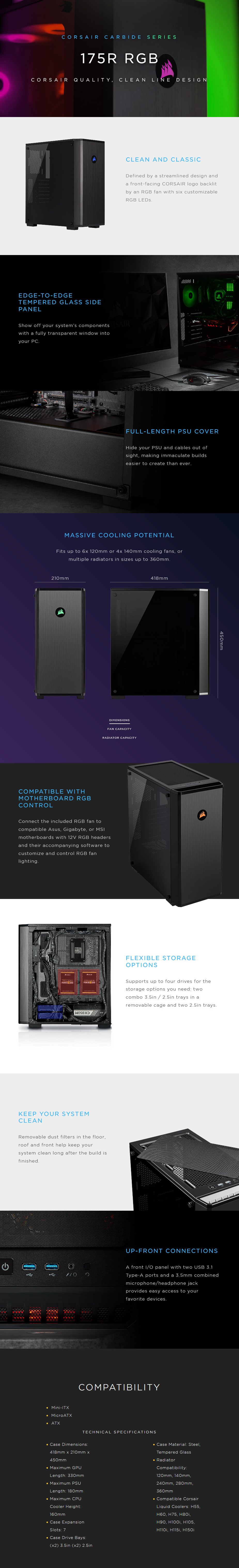 Corsair Carbide 175R RGB - Tempered Glass Side Panel - ATX, M-ATX & Mini-ITX Support - 7x Expansion Slots - Supports 2x 2.5" & 2x 3.5" Bays - Fan Support: 3x 120 or 2x 140mm Front, 2x 120/140mm Top & 1x 120mm Rear Fans - Pre-Installed Fan(s): 1x 120mm Front RGB Fan - Dust Filters: Front, PSU & Top - I/O Panel: 2x USB 3.0, Audio & Power - CC-9011171-WW - 2 Years Limited Warranty