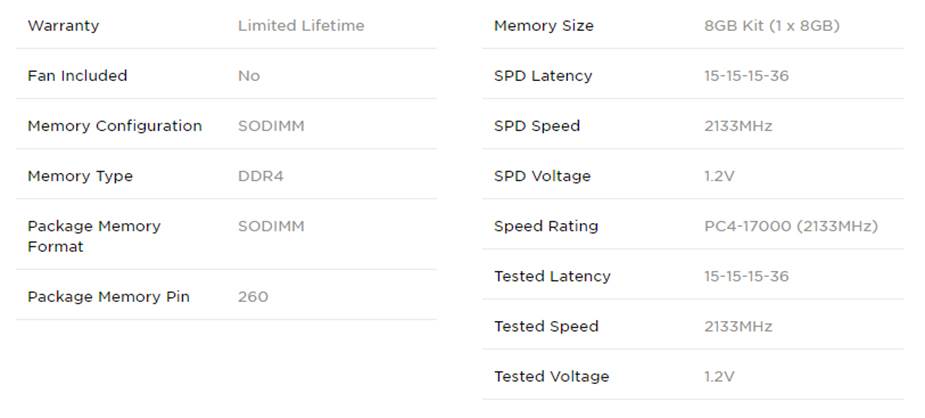 Product Name | Corsair CMSO8GX4M1A2133C15 8GB 8GB DDR4 SODIMM Memory |