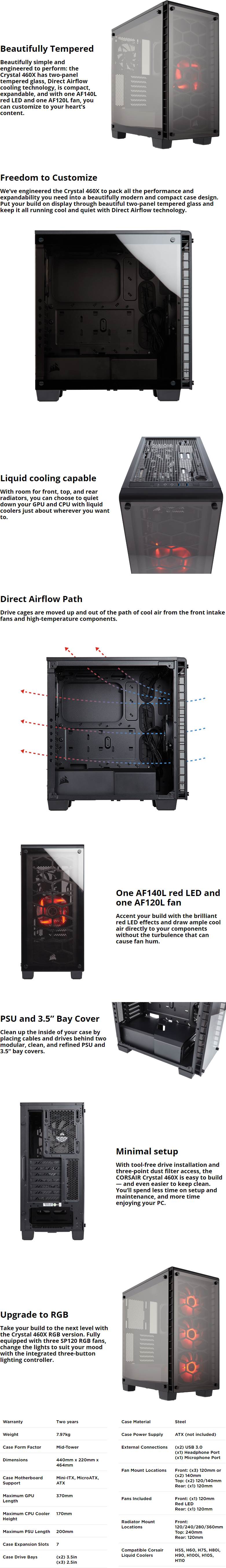 Mid-Tower Corsair Case: Crystal 460X - Black1x 140mm Red-LED Fan, 1x 120mm Fan, 2x USB 3.0, Tempered Glass Side Panels, Supports: ATX/mATX/mini-ITX