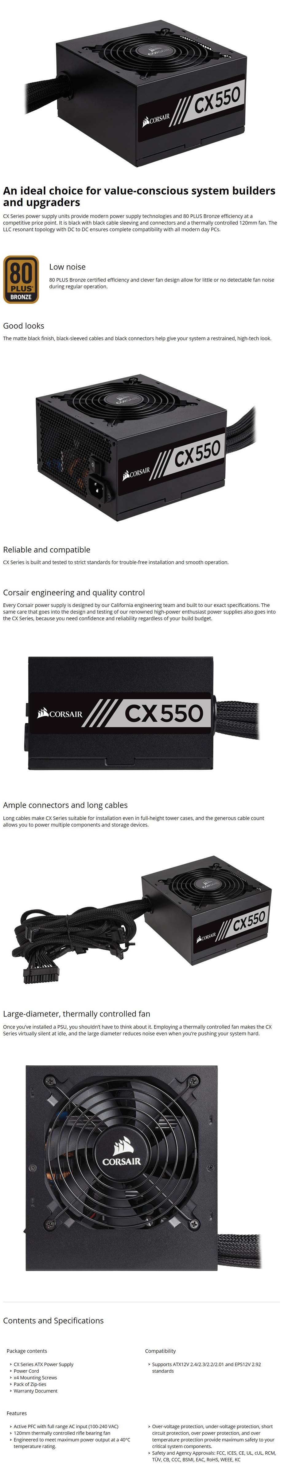 Corsair CX550 550W 80 Plus Bronze Power Supply - 120mm Rifle Bearing Fan - ATX - MTBF: 100,000 hours - Black - CP-9020121-AU - 3 Years Limited Warranty