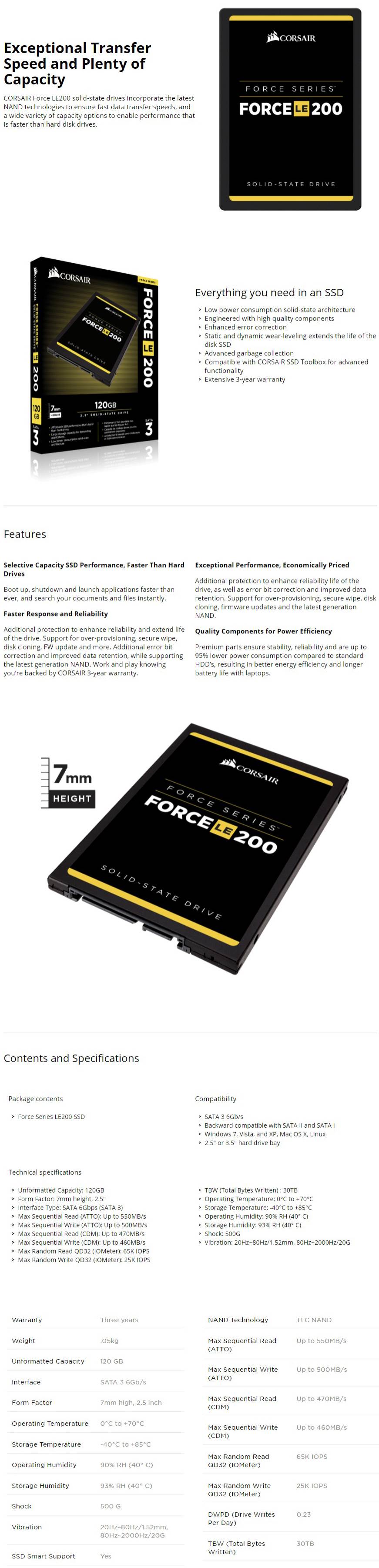 - CORSAIR Force LE200 solid-state drives incorporate the latest NAND technologies to ensure fast data transfer speeds, and a wide variety of capacity options to enable performance that is faster than hard disk drives.