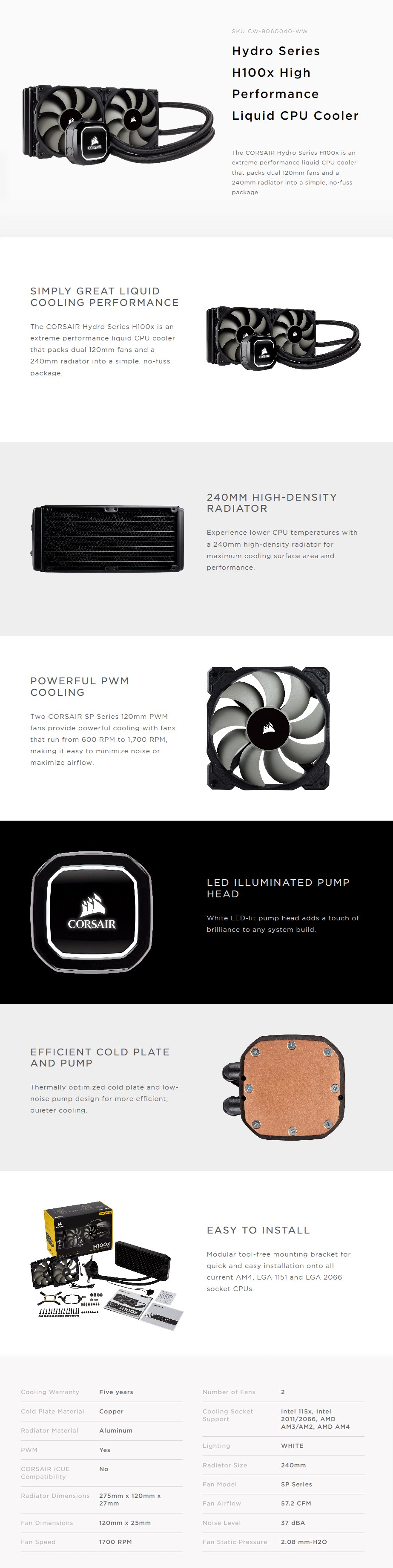 Corsair Hydro Series H100x 240mm High Performance Liquid CPU Cooler - White Lighting - Copper Cold Plate - Aluminum Radiator - PWM Fans - 2x 120mm x 25mm Fans (1700 RPM) - Air Flow: 56.2 CFM - Noise Level: 37 dBA - Static Pressure: 2.08mm-H20 - Cooling Socket Support: Intel 115x, Intel 2011/2066, AMD AM3/AM2, AMD AM4 - CW-9060040-WW - 5 Years Limited Warranty