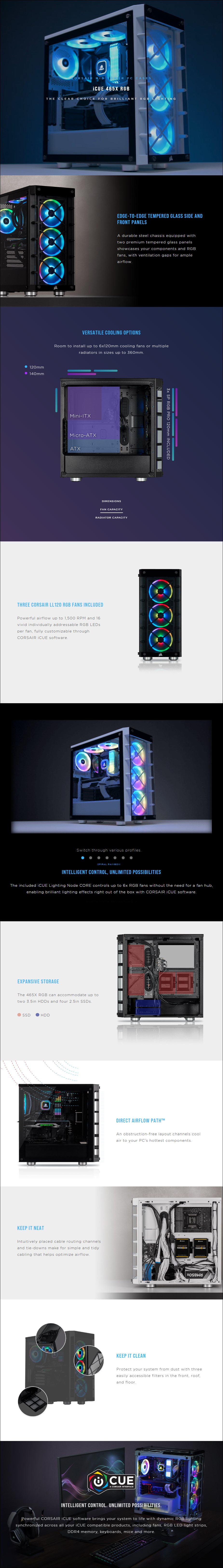 Corsair iCUE 465X RGB Smart Tempered Glass Mid-Tower ATX Case - Black - iCUE Lighting Node CORE - 7+2 Vertical Expansion Slots - Drive Bay Support: 2x 3.5" & 4x 2.5" - Tempered Glass Side/Front Panel - Fan(s) Included: 3x Corsair LL120 RGB Front Fans - Fan Support: 1x 120mm Rear, 2x 120mm or 1x 140mm Top & 3x 120mm or 2x 140mm Front Fans - Supports up to ATX Motherboards - CC-9011188-WW - 2 Years Limited Warranty