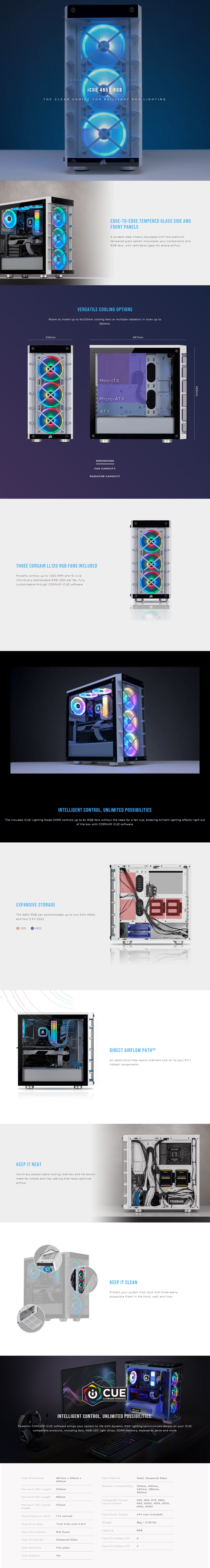 Corsair iCUE 465X RGB Tempered Glass ATX Mid-Tower Case - White - Drive Bays: 2x 3.5", 4x 2.5" - Expansion Slots: 7 + 2 Vertical - Max CPU Cooler Height: 170mm - Radiator Compatability: 120mm-360mm - Included Fans: 3x CORSAIR LL120 RGB - Motherboard Support: ATX, M-ATX, Mini-ITX - iCUE Enabled - CC-9011189-WW - 12 Months Limited Warranty