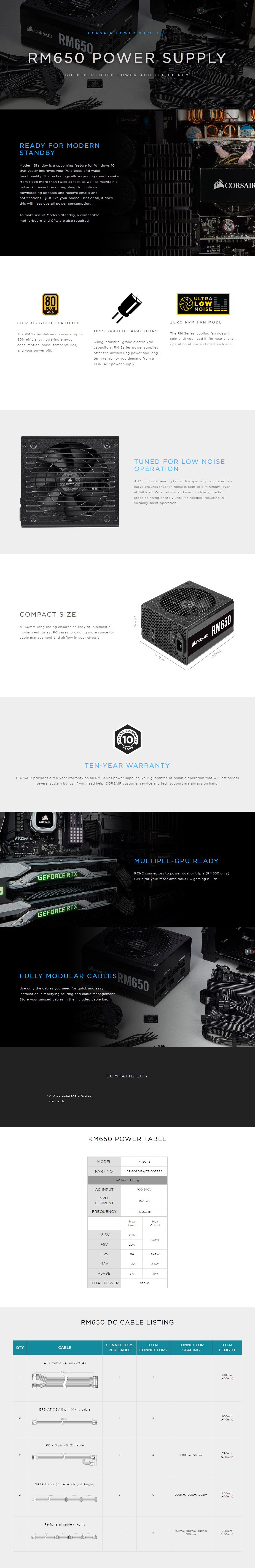 Corsair RM650 650W 80 Plus Gold Fully Modular Power Supply - Rifle Bearing - Form Factor: ATX - Fan Size: 135mm - Cable Type: Black, Low Profile - Modern Standby Compatible - Zero RPM Mode - Multi GPU Ready - Protection Circuits: Over Voltage, Under Voltage, Short Circuit, Over Temp, Over Power - MTBF: 100,000 hours - CP-9020194-AU - 10 Years Limited Warranty