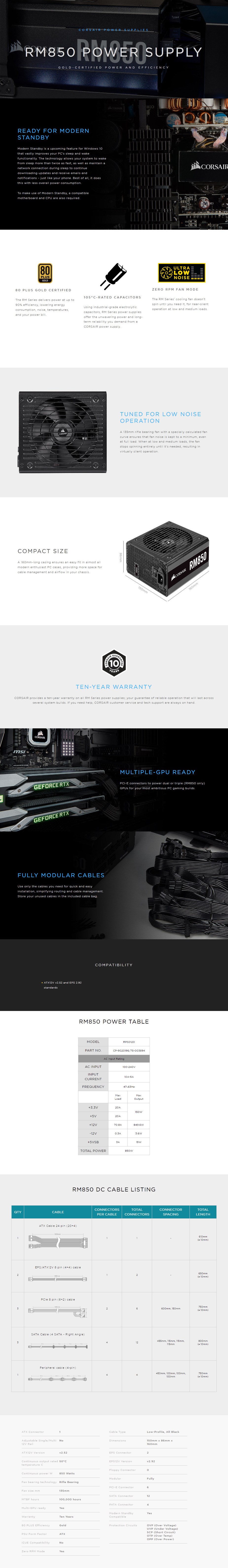Corsair RM850 850W 80 Plus Gold Fully Modular Power Supply - Rifle Bearing - Form Factor: ATX - Fan Size: 135mm - Cable Type: Black, Low Profile - Modern Standby Compatible - Zero RPM Mode - Multi GPU Ready - Protection Circuits: Over Voltage, Under Voltage, Short Circuit, Over Temp, Over Power - MTBF: 100,000 hours - CP-9020196-AU - 10 Years Limited Warranty