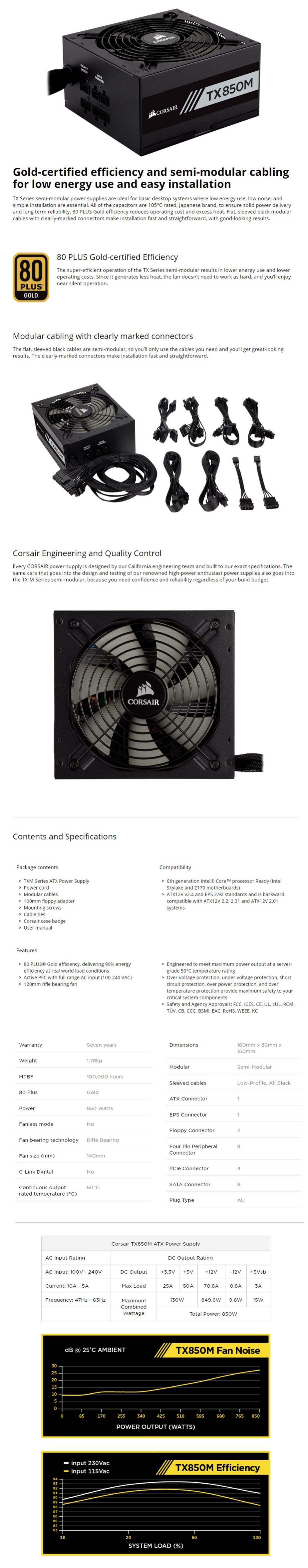 Description Corsair TX850M 850W 80 Plus Gold Semi-Modular Power Supply CP-9020130-AU