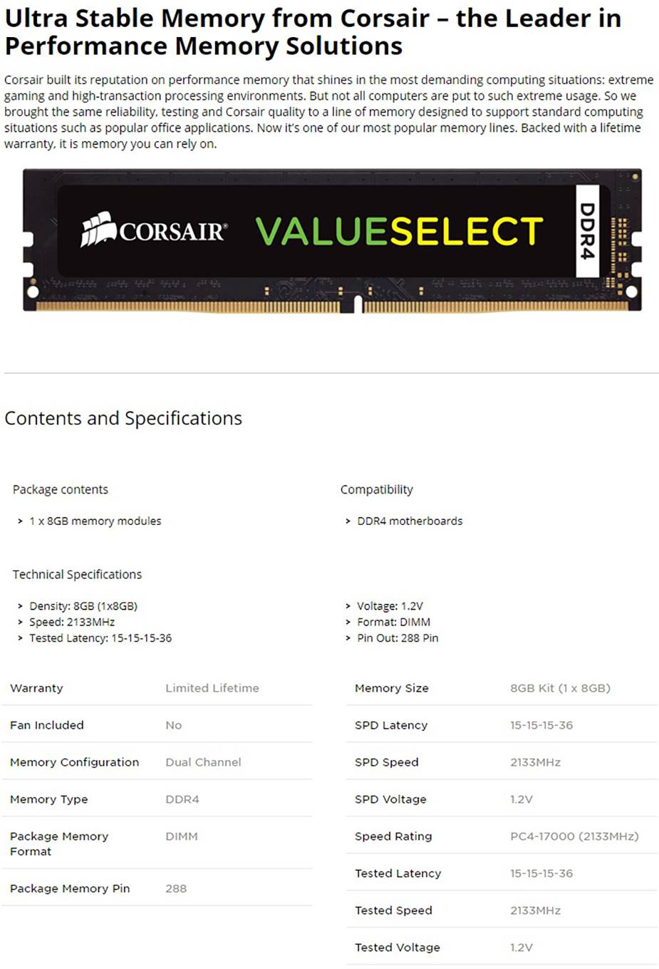 Product Name | Corsair Value Select 8GB (1x 8GB) DDR4 2133MHz Memory |