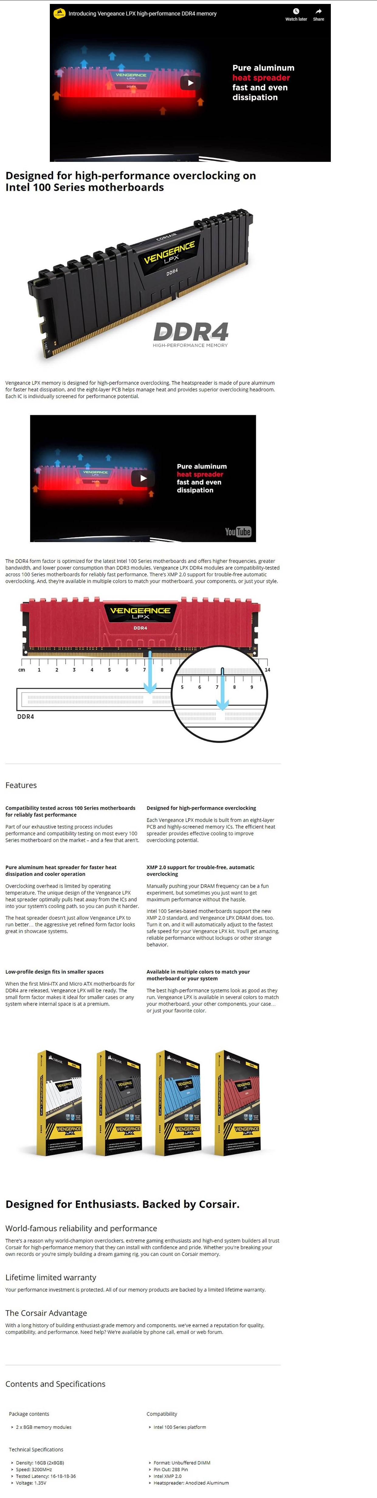 Corsair Vengeance LPX 16GB (2x 8GB) DDR4 3200MHz Memory CMK16GX4M2B3200C16 - Dual/Quad Channel - 288-pin - PC4-25600 (3200MHz) - CL16-18-18-36 Latency - Intel XMP 2.0 Performance - 1.35V Voltage - Limited Lifetime Warranty