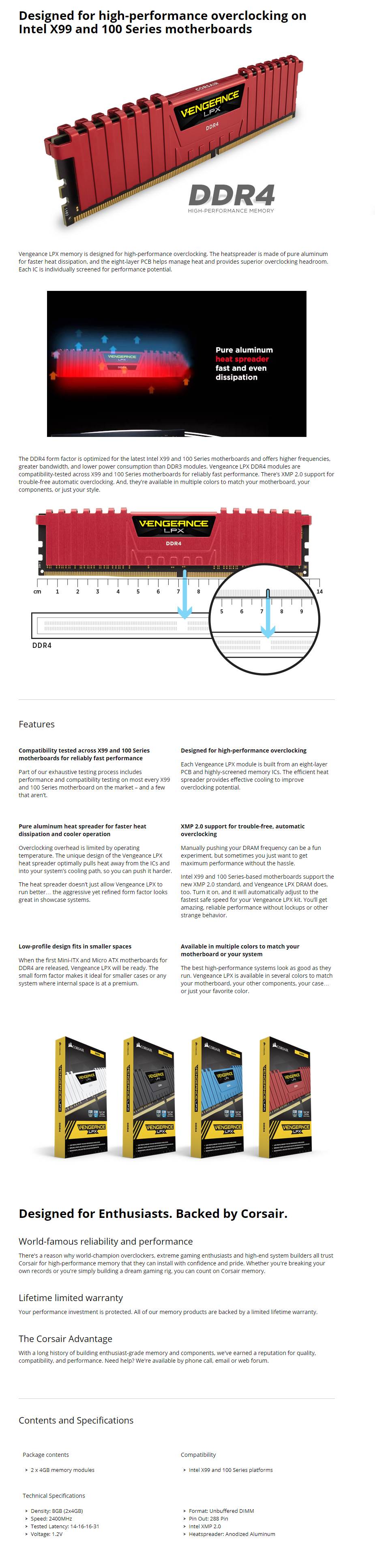 Product Name | Corsair Vengeance LPX 8GB 2x4GB DDR4 2400MHz Memory Red CMK8GX4M2A2400C14R |