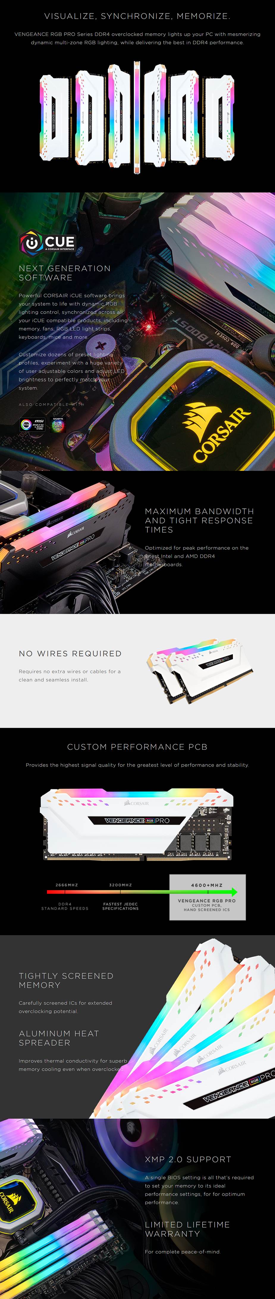 Corsair Vengeance RGB PRO 32GB (2x 16GB) DDR4 2666MHz Memory - White - 2 x 16GB memory modules - 16-18-18-35 - 1.2V - 2666MHz - Heat Spreader: Anodized Aluminum - Package Memory Format: DIMM - XMP 2.0 - 288-Pin - Intel 100/200/300 Series & Intel X299 Compatible - CMW32GX4M2A2666C16W - Lifetime Product Limited Warranty