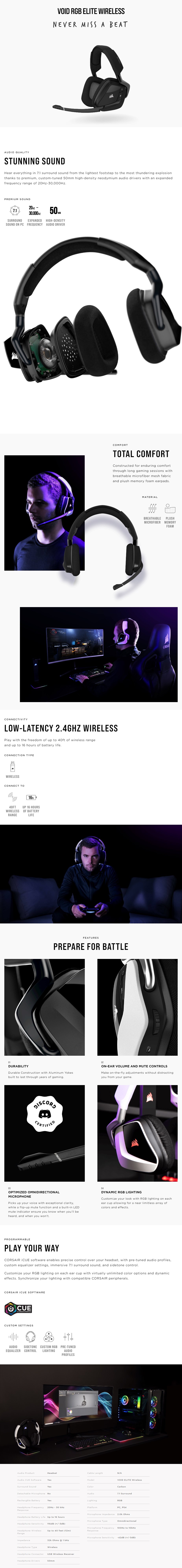 Corsair VOID RGB ELITE Wireless Premium 7.1 Surround Gaming Headset - Carbon - Rechargeable Battery - Battery Life: Up to 16 hours - Wireless Range: Up to 12m - Connector: USB Wireless Receiver - Frequency Response: 20Hz - 30 kHz - Sensitivity: 116dB (+/-3dB) - - Impedance: 32k Ohms @ 1 kHz - Drivers: 50mm - Microphone Impedance: 2.0k Ohms - Microphone Type: Omnidirectional - Microphone Frequency Response: 100Hz to 10kHz - Microphone Sensitivity - CA-9011201-AP - 2 Years Limited Warranty