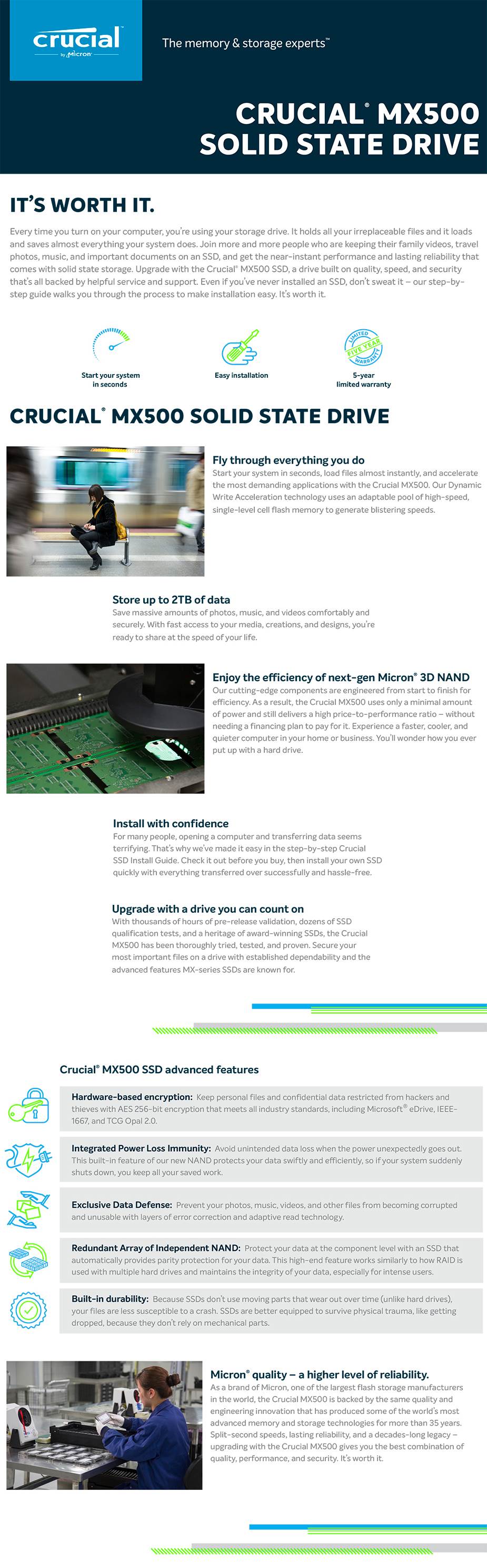 Crucial MX500 500GB M.2 Type 2280 SATA III SSD - 560 MB/s Read, 510 MB/s Write - Random Read IOPS: 95k, Random Write IOPS: 90k - Includes mounting screws & Acronis True Image for Crucial cloning software - CT500MX500SSD4 - 5 Years Limited Warranty