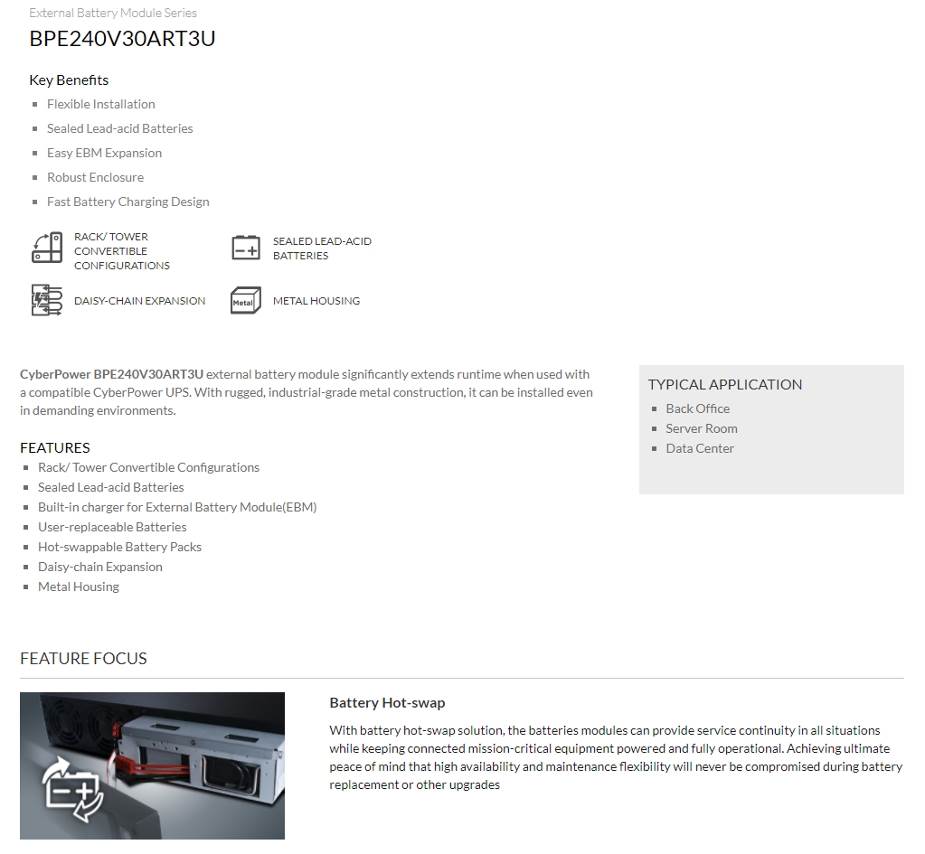Product Name | CyberPower BPE240V30ART3U Extended Battery Pack 3U Metal Housing |