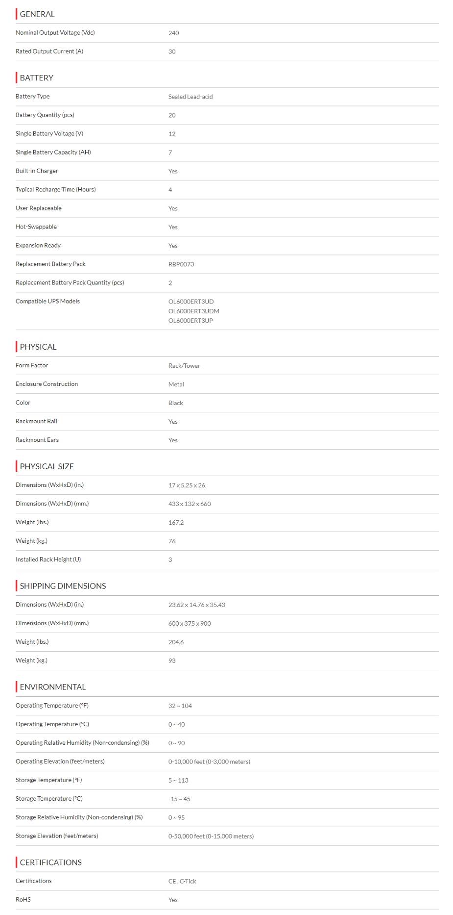 GENERALNominal Output Voltage (Vdc): 240Rated Output Current (A): 30BATTERYBattery Type: Sealed Lead - acidBattery Quantity (pcs): 20Single Battery Voltage (V): 12Single Battery Capacity (AH): 7Built – in Charger: YesTypical Recharge Time (Hours): 4Hot-swappable: YesExpansion Ready: YesReplacement Battery Pack: RBP0073Replacement Battery Pack Quantity (pcs): 2Compatible UPS Models: OL6000ERT3UD/OL6000ERT3UDM/OL6000ERT3UPPHYSICALForm Factor: Rack/TowerEnclosure Construction: MetalColor: BlackRackmount Rail: YesRackmount Ears: YesPHYSICAL SIZEDimensions (WxHxD) (mm): 433 x 132 x 660Weight (kg): 76Installed Rack Height (U): 3SHIPPING DEMENSIONSDimensions (WxHxD) (mm): 600 x 375 x 900Weight (kg): 93