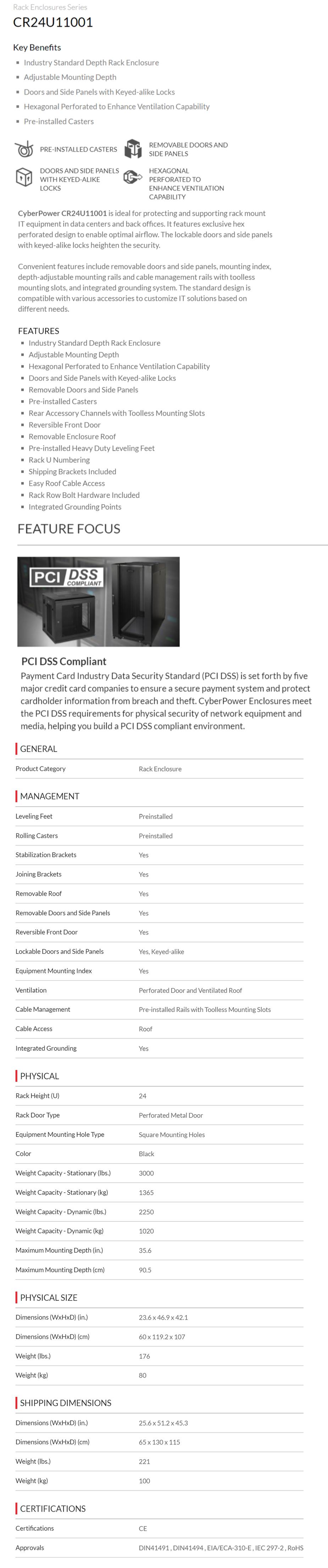 Product Name CyberPower CR24U11001 19"" 24U 1070mm Deep Rack Enclosure, Hex Perforated Metal Door, With 4 Casters