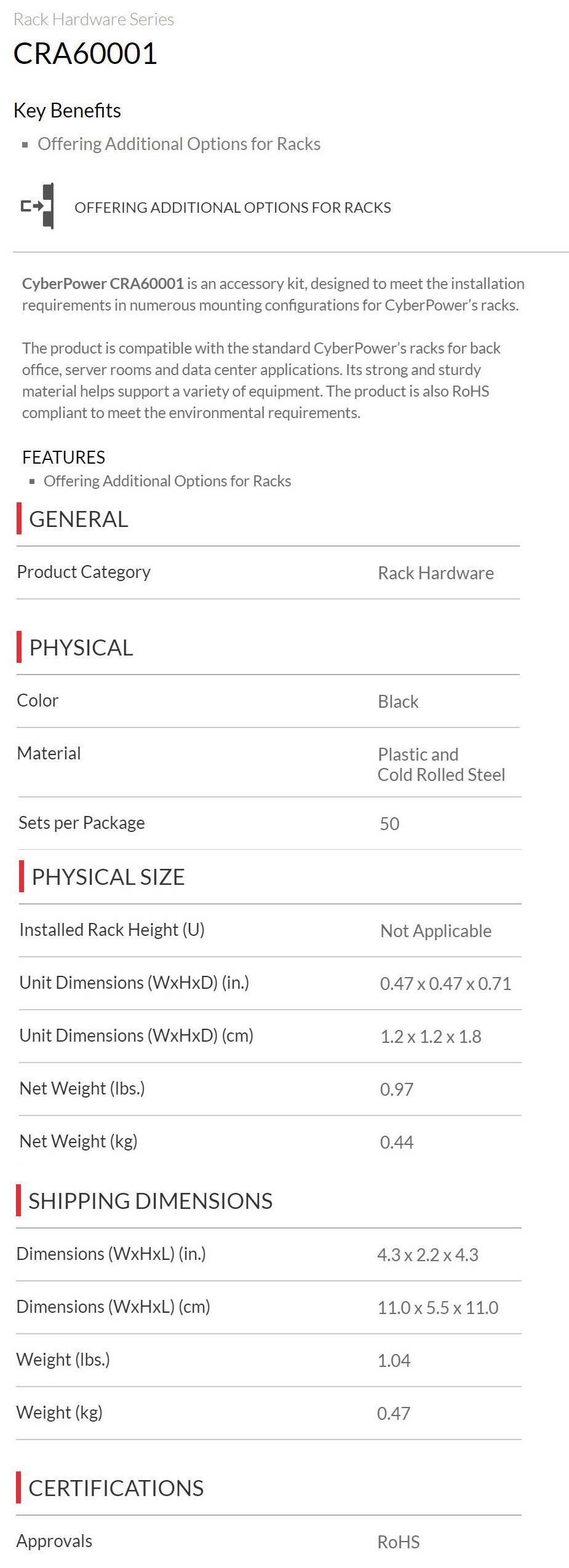 Product Name | CyberPower CRA60001 M6 Cage Nut and Screw Hardware (M6), 50 Per Pack |
