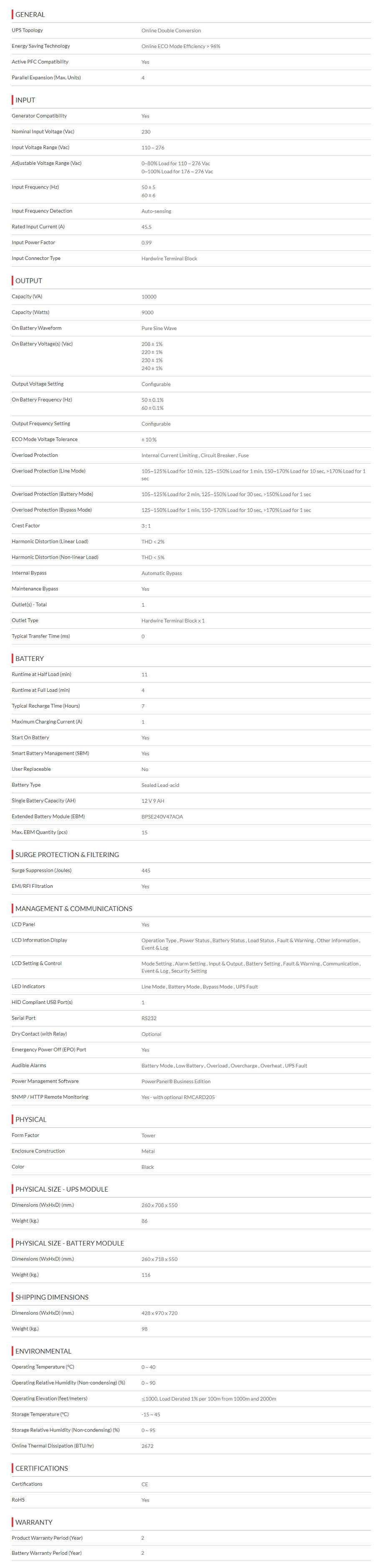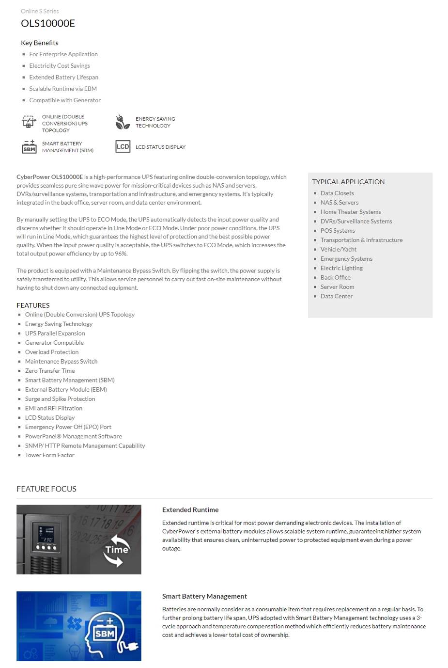 Product Name | CyberPower Online S Series OLS10000E Tower 10000VA/9000W Pure Sine Wave UPS |